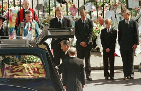 Hoàng tử William, Hoàng tử Harry và Thái tử Charles dõi theo quan tài của Công nương Diana được đặt lên một chiếc xe tang tại tu viện Westminster Abbey, sau lễ tang của bà vào ngày 6/9/1997. Hàng triệu người đã đứng dọc các con phố để tỏ lòng kính trọng đối với Công nương xứ Wales. (Ảnh: Reuters)