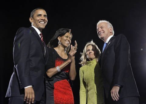 Tổng thống đắc cử Barack Obama và phu nhân Michelle (trái) cùng Phó Tổng thống Joe Biden và phu nhân, Jill ăn mừng sau bài phát biểu được tán dương của Obama tại đêm cuộc mít-tinh bầu cử ở Chicago hôm 4/11/2008. (Ảnh: AP)
