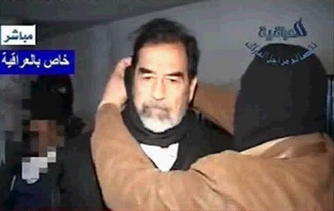 Truyền hình Al Iraqiya phát hình ảnh một miếng vải được quấn quanh cổ cựu tổng thống Iraq Saddam Hussein trước khi bị hành hình tại Baghdad vào ngày 30/12/2006. Hussein bị treo cổ vì tội chống lại nhân quyền, một kết thúc kịch tính và khắc nghiệt đối với một nhà lãnh đạo thống trị Iraq trong suốt 3 thập kỷ trước khi bị Mỹ lật đổ. (Ảnh: Reuters)
