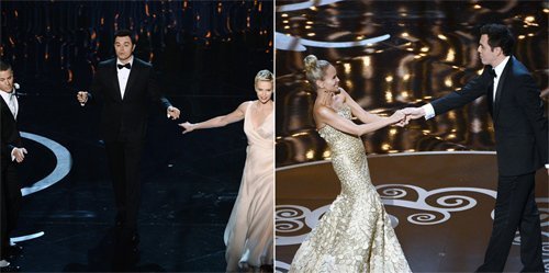 Người chủ trì lễ trao giải Seth Macfarlane với những màn khuấy động sân khấu cùng Channing Tatum, Charlize Theron (trái) và Kristin Chenoweth với màn diễn kết thúc dành cho những người bị trượt Oscar.