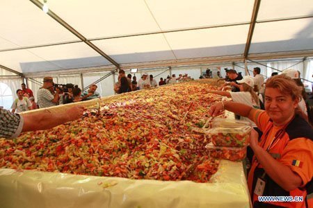 Món salad rau xanh lớn nhất thế giới tại Bucharest, Romania được làm từ 4 tấn xà lách, 4 tấn dưa chuột, 2 tấn hạt tiêu, 2 tấn hành, 2 tấn cà rốt, 400kg ô-liu, 400 lít dầu ô-liu và 400kg muối.