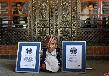 Chandra Bahadur Dangi chụp ảnh với hai tờ giấy chứng nhận sau khi trở thành người đàn ông thấp nhất thế giới và người đàn ông thấp nhất có tên trong sách kỷ lục Guinness tại Katmandu, Nepal. Được biết, người đàn ông 72 tuổi này chỉ cao 54,6cm.