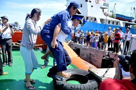 Ngư dân gặp nạn được cảnh sát biển đưa vào bờ (Ảnh: Đại đoàn kết) |