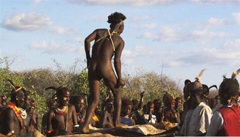 Những cậu bé từ 12-15 tuổi ở bộ lạc Hamar (Ethiopia) phải tham gia lễ nhảy bò để chứng minh sự trưởng thành của mình. Họ sẽ không mặc gì mà chỉ được quấn vài sợi dây thừng lên người rồi nhảy qua nhảy lại 4 lần trên lưng những con bò trước sự chứng kiến của mọi người. Nếu như không nhảy qua, họ không những không thể kết hôn mà thậm chí còn bị bò giẫm qua người.