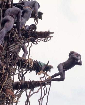 Với những dây nho cuốn quanh mắt cá chân, những chàng trai trên đảo Pentecost sẽ nhảy từ trên tháp cao khoảng 30 m xuống đất để chúc mừng lễ trưởng thành của mình. Ngoài ra, họ còn phải đảm bảo điều kiện tóc hoặc đầu phải chạm đất khi "hạ cánh".