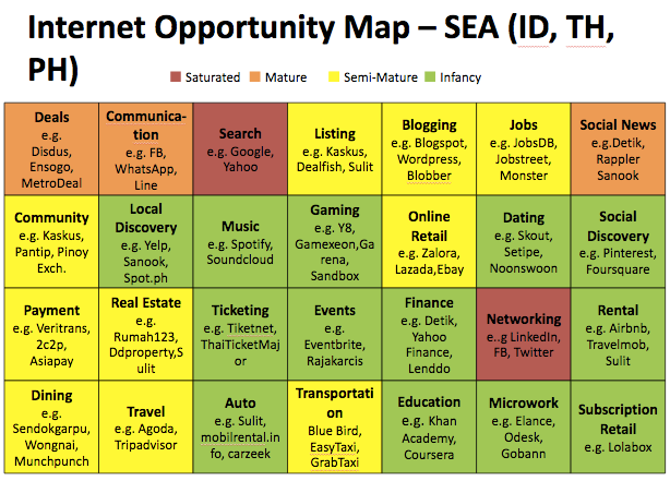 Sơ đồ này được dựng bởi Nitin Mittal, trưởng phòng phát triển kinh doanh tại SingTel-SoftBank, trong đó chỉ ra những cơ hội còn rộng mở và cả những mảng đã bị khai thác hết của thị trường internet tại Đông Nam Á, cụ thể là 3 nước Indonesia, Thái Lan và Phillipines. Tác giả cũng hy vọng sẽ đưa ra 1 sơ đồ cho riêng Việt Nam và Malaysia trong các báo cáo sau.
