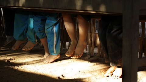 Một cách thư giãn đôi chân của cô trò nhỏ lớp 1 ở điểm trường Cửa Vạn.