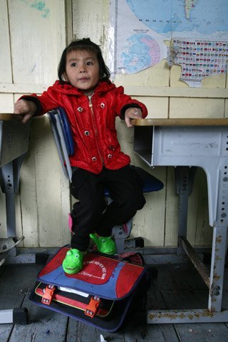Một tư thế ngồi viết lạ tại điểm trường Cửa Vạn do bàn ghế không đúng kích cỡ.