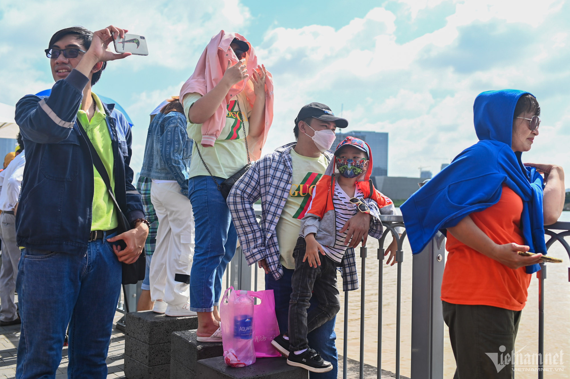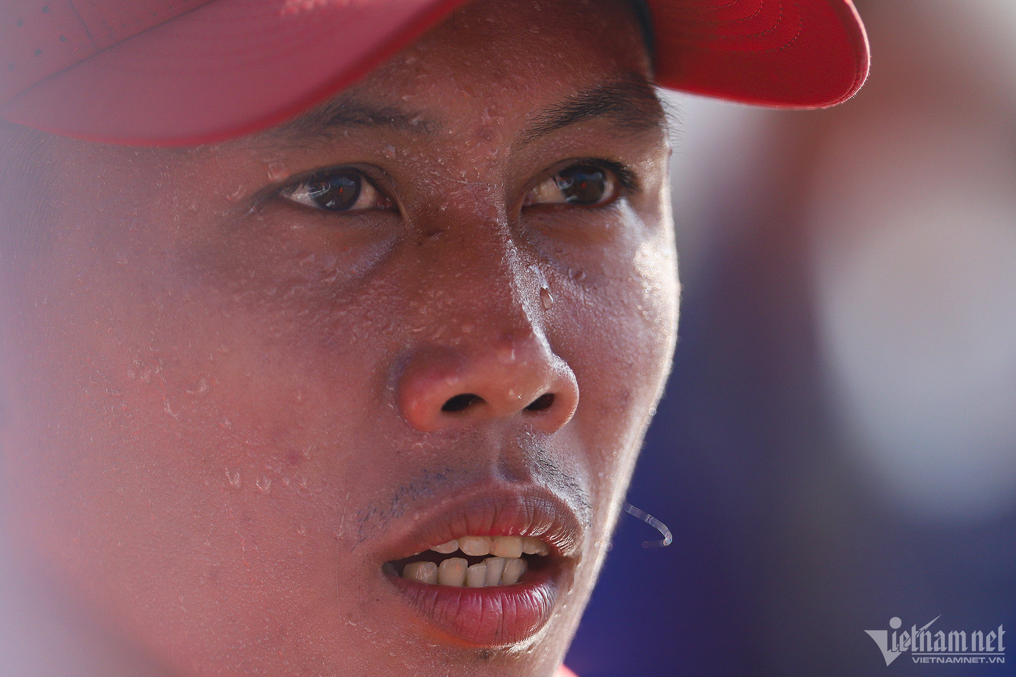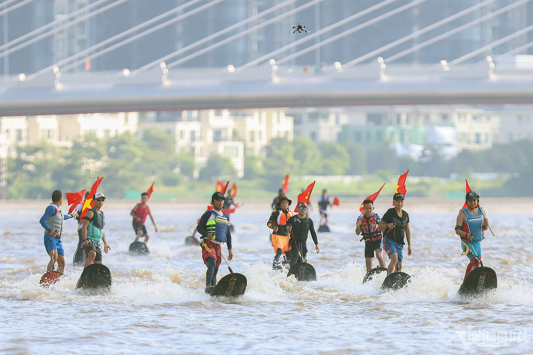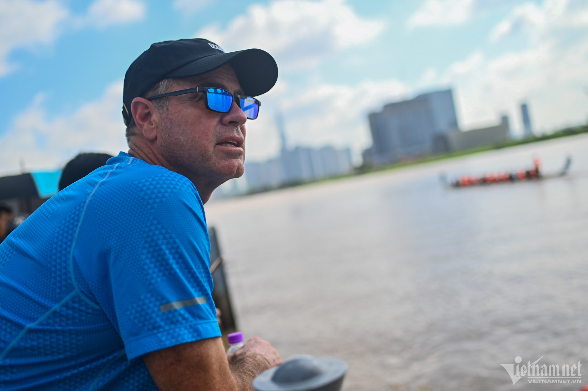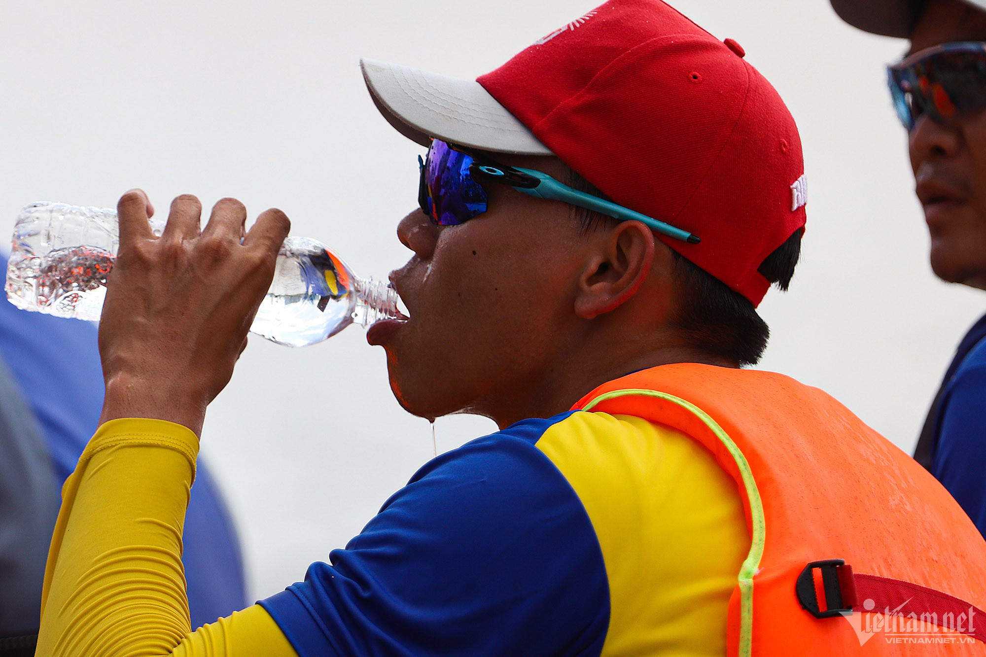 Càng về trưa, nhiệt độ càng tăng, sông Sài Gòn "nóng" hơn, các VĐV liên tục tiếp nước để giải nhiệt.