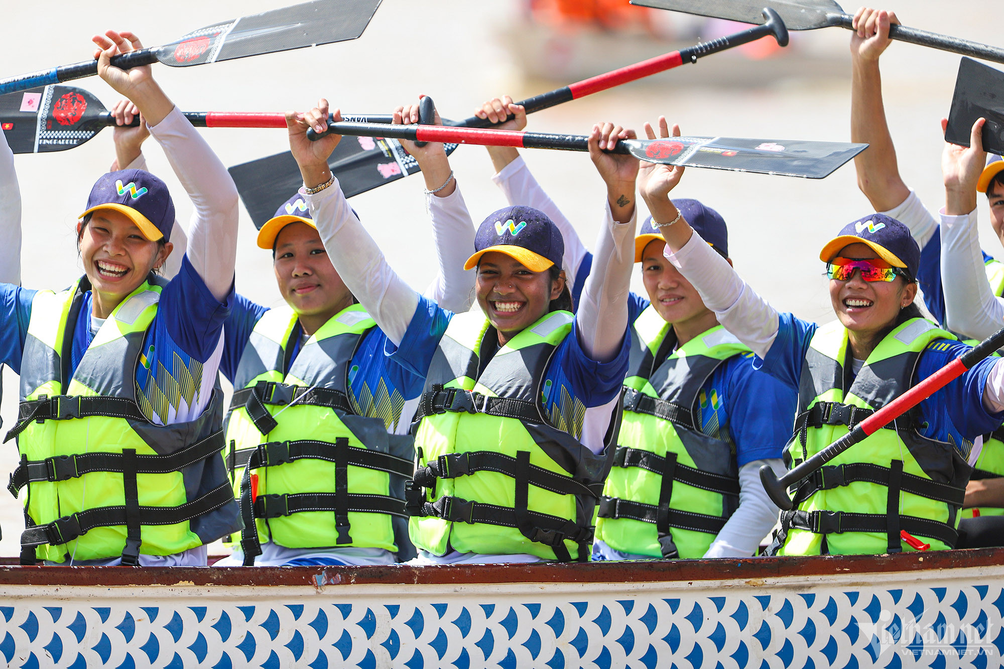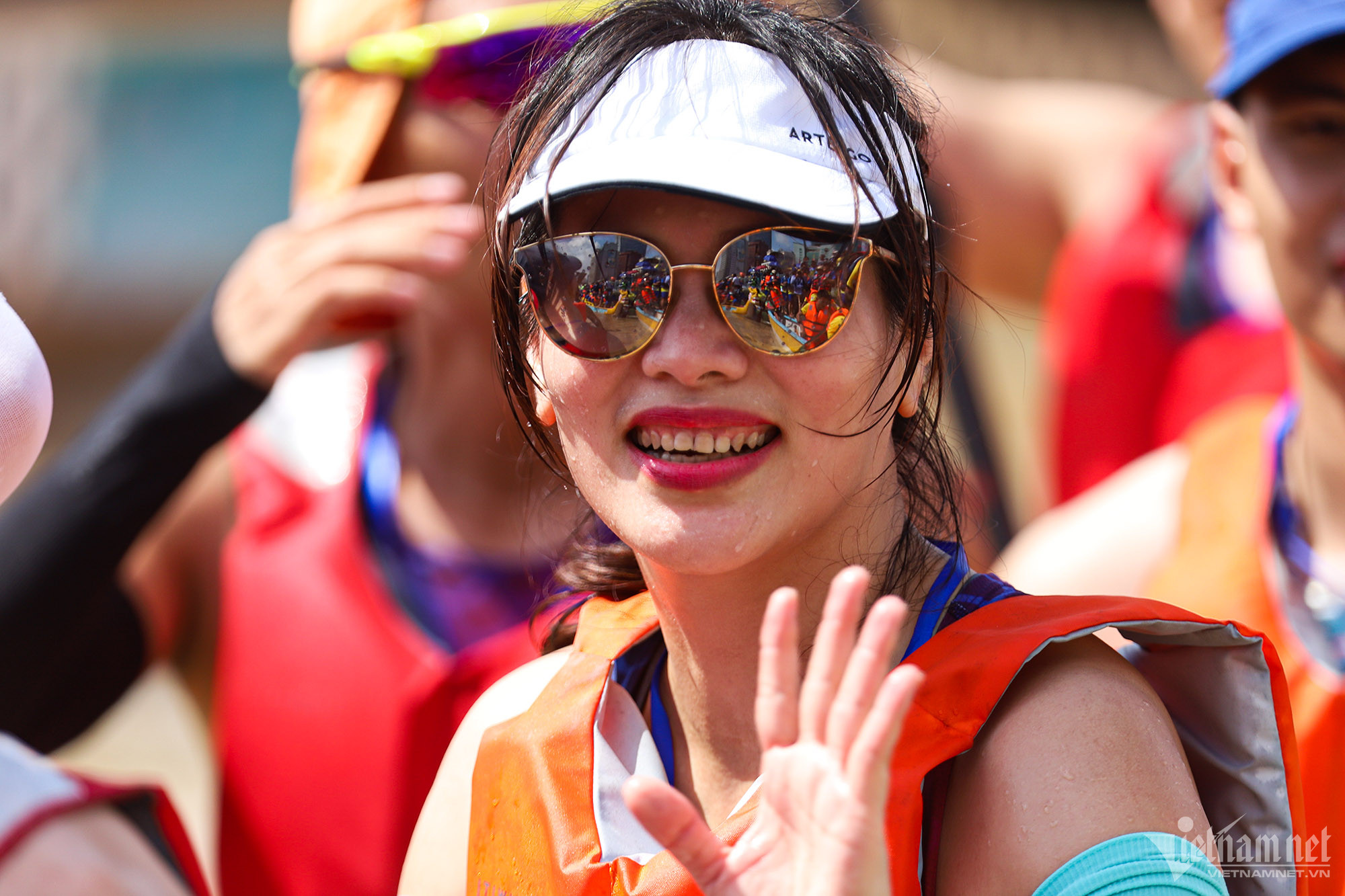 Trên khán đài, hàng trăm cổ động viên vui vẻ hồi hộp hò reo theo từng nhịp chèo của các vận động viên.