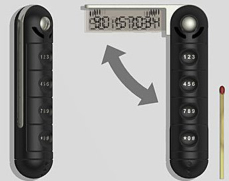 Chiếc điện thoại này có kích thước bằng một chiếc móc chìa khóa. Màn hình của máy cũng siêu nhỏ, có thể gập gọn vào trong thân máy.