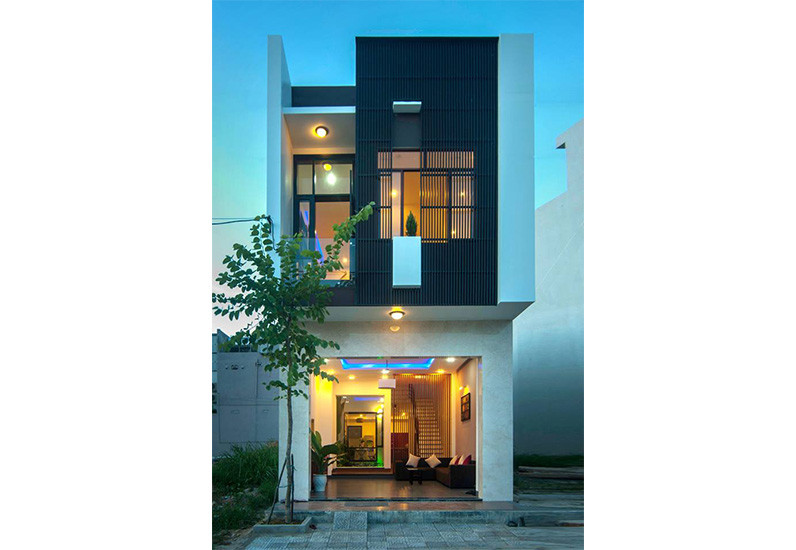 Ngôi nhà có mặt tiền rộng. Hệ lam nhựa tổng hợp hoặc thép giả gỗ để cản nắng cho nhà nhưng vẫn đảm bảo khí lưu thông, gió mát mẻ. Hình khối vuông vức, ít chi tiết để giảm tối đa chi phí.