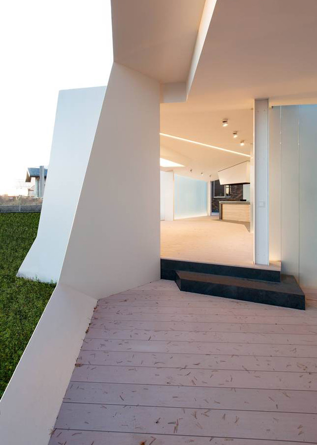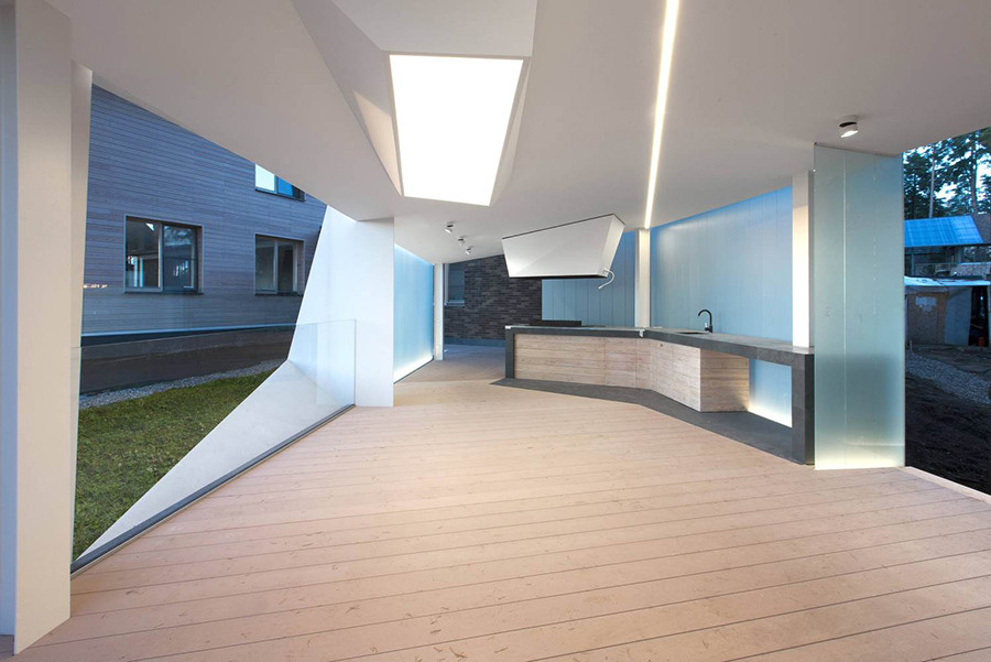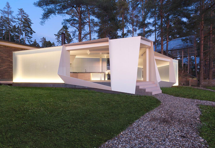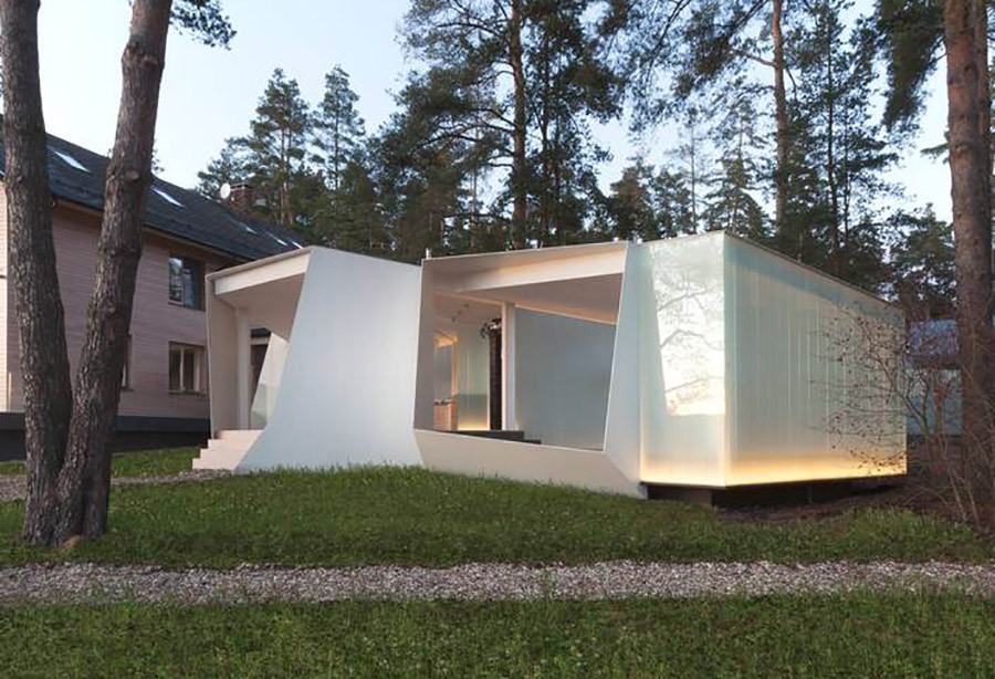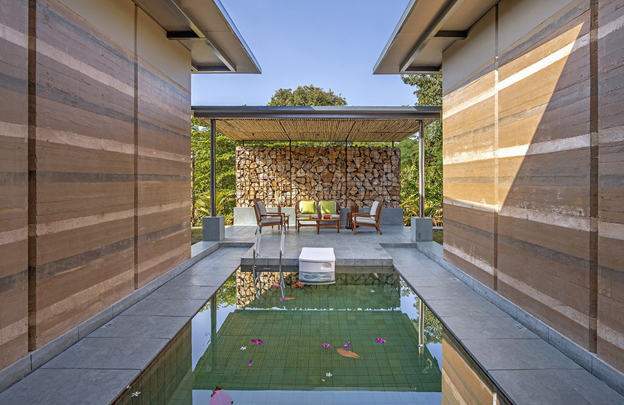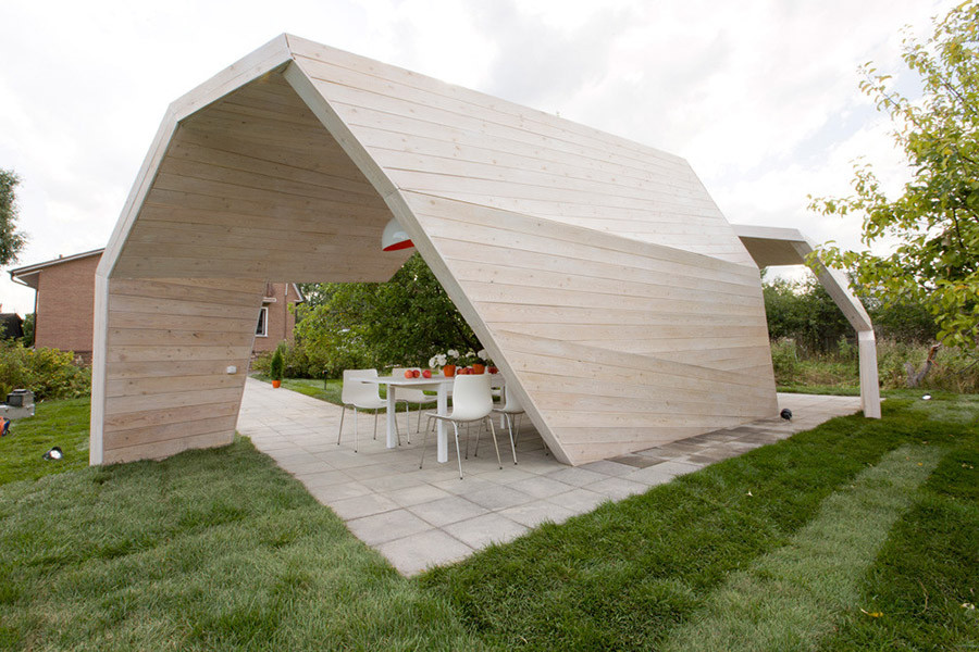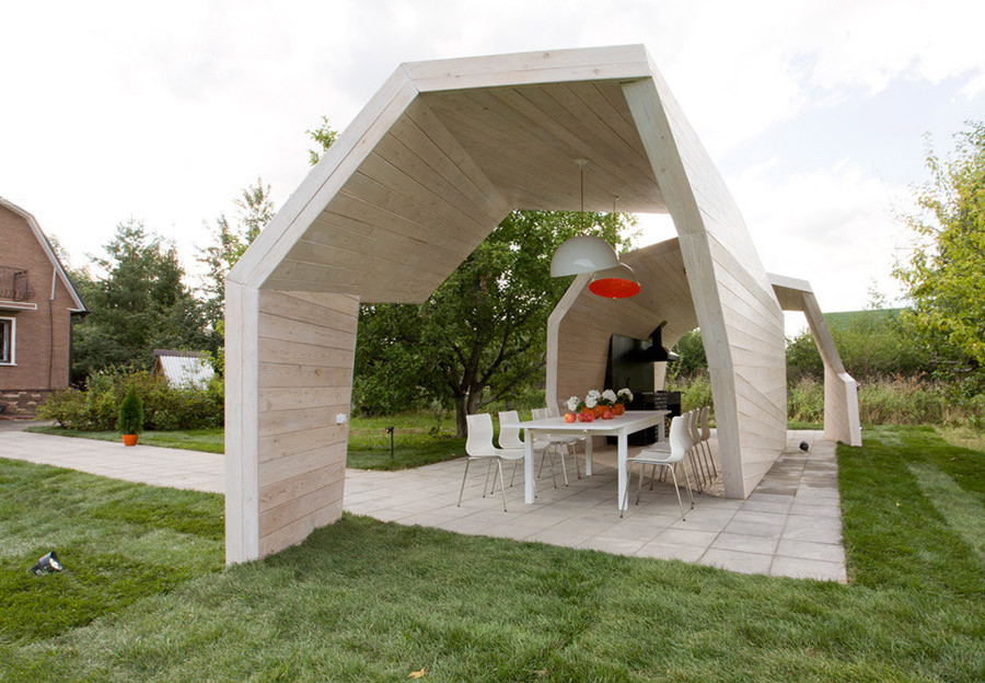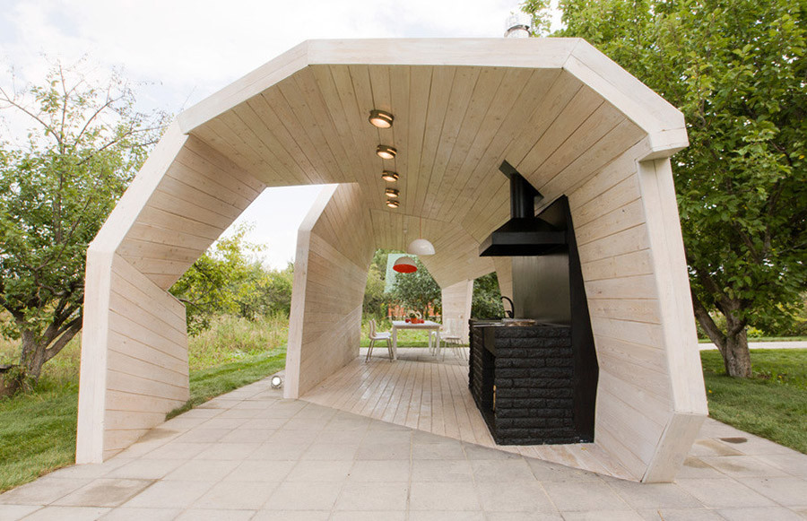 Đây là nhà chòi sân vườn nằm trong khuôn viên ngôi nhà có diện tích gần 300m2 ở một vùng quê của Ấn Độ. Khu vực hồ bơi và nhà chòi là không gian thư giãn của các thành viên trong gia đình. Hồ bơi và nhà chòi chia các phòng ngủ và không gian sinh hoạt của ngôi nhà ra làm hai phần. Để ngôi nhà trở thành không gian sống thân thiện với môi trường, gia chủ đã sử dụng các vật liệu tái chế hay vật liệu hoàn thiện và đồ nội thất mua từ các công ty có kỹ thuật sản xuất thân thiện với môi trường. Trần của nhà chòi được làm từ tre, thể hiện sự mộc mạc, gần gũi. Trong khi đó, một vách của nhà chòi là tường rọ đá. Những tảng đá này là vật liệu có sẵn tại địa phương. Bức tường rọ đá vừa là một tác phẩm nghệ thuật đặc sắc vừa giúp cho không gian thư giãn có được sự riêng tư. Gia chủ là một thuyền trưởng và rất thích nấu nướng nên khi thiết kế nhà chòi này, kiến trúc sư đưa ra ý tưởng cấu trúc công trình hình xoắn ốc như sóng biển. Bên trong nhà chòi có lò nướng và khu vực ăn uống riêng biệt. Nhà chòi này có cấu tạo gồm 14 mặt phẳng được làm bằng gỗ thông sơn màu trắng ghép lại với nhau. Quang cảnh xung quanh nhà chòi là bãi cỏ xanh và vườn cây ăn trái rộng lớn. Màu sắc trung tính làm cho nhà chòi như đang chìm trong màu sắc sặc sỡ của khu vườn, từ màu xanh của mùa hè đến màu vàng và đỏ vào mùa thu. Sân vườn của ngôi nhà này có diện tích 280m2, gia chủ đã sửa sang lại sau khi chuyển đến đây sinh sống. Khi thiết kế lại sân vườn, gia chủ muốn nơi đây trở thành không gian mở, có nhà chòi và thác nước. Kiến trúc sư đã đánh giá lại toàn bộ ngôi nhà để có phương án kết nối các không gian chức năng khác với khu vườn. Điểm nhấn của khu vườn là ngôi nhà chòi có kích thước vừa phải. Nơi này được kết nối với phòng khách bằng một lối đi lát gỗ. Phía sau là một khu vực nghỉ ngơi khác với bếp và không gian thư giãn kiểu Thái. Gia chủ chia sẻ, sân vườn với nhà chòi đã trở thành không gian thư giãn của các thành viên trong nhà. Thỉnh thoảng, đây cũng là nơi diễn ra các bữa tiệc của gia đình. Không gian này sẽ trở nên lung linh hơn khi về đêm nhờ hệ thống đèn chiếu sáng. Trong khu vườn với bãi cỏ rộng lớn và những cây thông cổ thụ, gia chủ đã xây dựng một nhà chòi rất độc đáo. Kết cấu công trình khá lớn nhưng không nặng nề, không gian bên trong thông thoáng. Kiến trúc sư muốn giữ lại những cây thông cổ thụ xinh đẹp nên thiết kế nhà chòi cũng bị ảnh hưởng bởi những vị trí của các cây thông. Vào ban đêm, hệ thống đèn LED được lắp theo các đường bao bọc nhà chòi làm cho công trình nổi bật hơn. Nhà chòi được chia làm 2 khu vực. Khu vực gần nhà chính là khu ăn uống. Nơi đây được bố trí quầy bếp, bồn rửa, lò nướng... và có không gian kê bàn ăn dài đủ phục vụ cho 12 người. Phần còn lại của nhà chòi là không gian tiếp khách. Đây là nhà chòi mà gia chủ muốn xây dựng để sử dụng lâu dài. Hệ khung của công trình được làm bằng bê tông, khung sắt và mái được đúc sẵn. Các vách cùa nhà chòi làm bằng kính, được dán một lớp phim mờ.