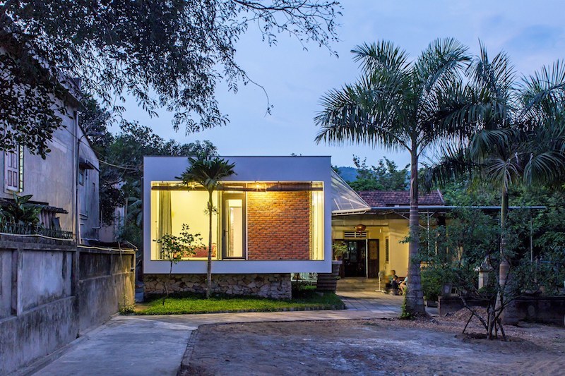 Khối hình bê tông được ngăn cách hệ cửa kính mở quay kết hợp với vách kính và bức tường gạch màu đỏ, đem đến sức sống mới lạ cho mẫu nhà ống 1 tầng. Ngôi nhà này có chi phí xây dựng chỉ 580 triệu.