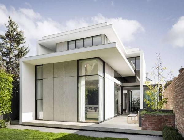 Điểm nhấn màu xanh ở mảng tường bên ngoài với thiết kế khối hình học tạo ấn tượng cho mẫu nhà này. Cửa kính lớn nhằm giúp ánh sáng vào trong nhà một cách tốt nhất.