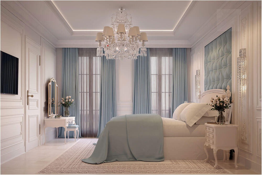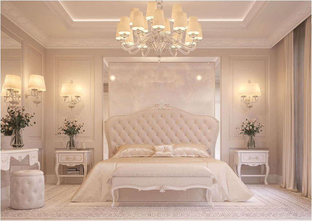 Gam màu trắng, màu ghi là những sắc màu đặc trưng của những công trình phòng ngủ cổ điển kiểu Pháp. Màu sắc này kết hợp với những nội thất tân cổ điển mang đến vẻ đẹp dịu nhẹ, sang trọng. Căn phòng được trang trí thêm những lọ hoa, rèm cửa hay thảm sàn mang đến một không gian lãng mạn.