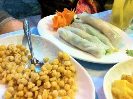 Phở cuốn là món ăn được làm từ những tấm phở vuông cuộn thịt bò và các loại rau sống. Nhưng bạn cũng có thể thay thịt bò bằng trứng rán, loại thực phẩm được nhiều người ăn chay chấp nhận. Tại các hàng phở cuốn, bạn cũng có thể gọi thêm món phở chiên phồng và ngô chiên, những món chay rất hấp dẫn.