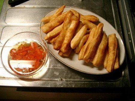 Đây là những “que” bột được rán cho nở bung, ăn với nước mắm pha ngọt. Nó là một món ăn vặt khá ngon miệng, đặc biệt khi ăn nóng. Bạn cũng có thể gọi quẩy khi ăn phở, bằng cách chấm nó vào nước dùng.