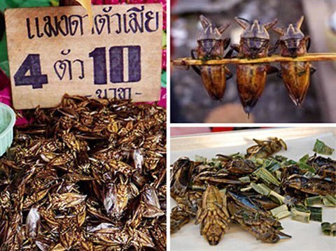 | Bọ cánh cứng khổng lồ: Những con bọ cánh cứng thường được chiên hoặc nướng lên để trở thành món ăn khoái khẩu của nhiều người. Người ta cho rằng nó có mùi vị giống như là sò điệp. Món ăn này rất phổ biến tại Thái Lan, nơi mà trong tự nhiên có rất nhiều bọ cánh cứng. |