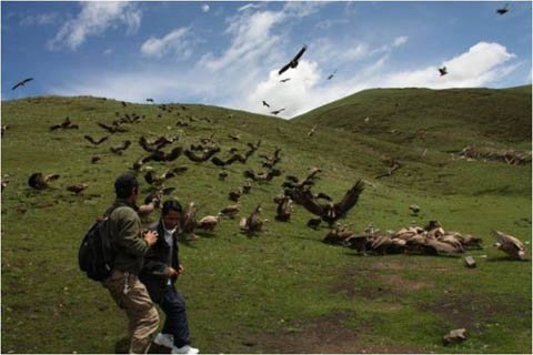 Sau khi người thân của mình qua đời, những người dân thảo nguyên Tây Tạng sẽ đưa xác người quá cố lên một ngọn núi cao và làm lễ gọi những con chim kền kền tới...ăn thịt. Người Tây Tạng tin rằng sau khi chim kền kền ăn xong và bay lên trời thì linh hồn của người chết cũng lên thiên đàng. Tuy nhiên, cũng có cách giải thích khác rằng việc tiến hành chôn cất người chết hay thả trôi theo dòng nước ở vùng thảo nguyên là hết sức khó khăn, gỗ cũng là một nguyên liệu rất quý nên không thể dùng hỏa táng được.