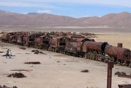 Một trong những điểm du lịch lớn nhất tại tây nam Bolivia là một nghĩa địa xe lửa lỗi thời nằm cách ngoại ô Uyuni 3km. Nơi này từng là trung tâm phân phối cho các đoàn tàu chở khoáng sản trên đường tới các cảng ở Thái Bình Dương.