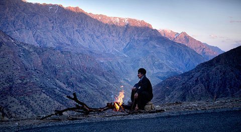 Một người đàn ông Kurd được thuê để canh máy làm đường, nhóm lửa giữa đêm lạnh gần đường vào Palangan.