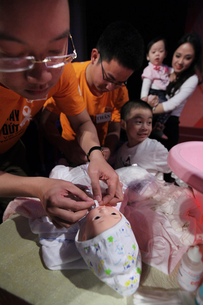 Thí sinh Lê Văn Thân đang trổ tài tắm cho trẻ. Búp bê được coi như đứa trẻ và cứ 2 thí sinh tắm cho một búp bê.