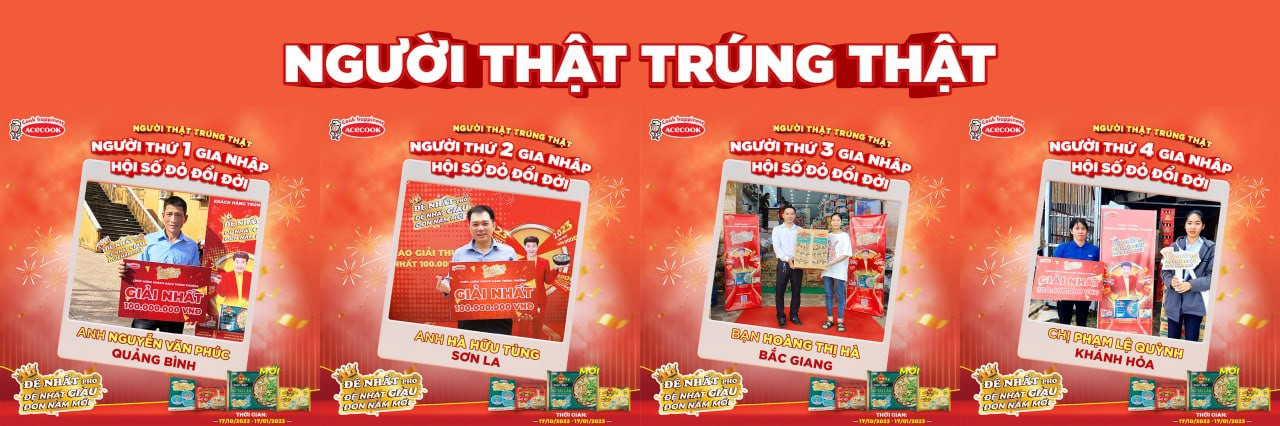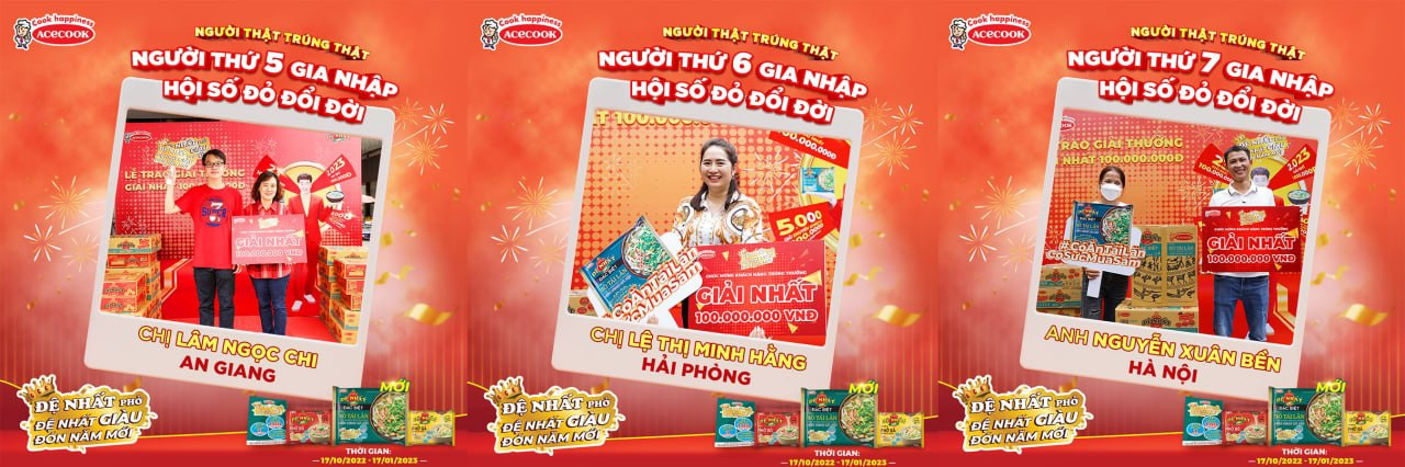 Cho đến ngày 19/12, Acecook Việt Nam đã trao tận tay 12 Giải Nhất (100 triệu đồng/ giải) và hàng ngàn Giải Nhì (trị giá 1 triệu đồng/ giải), Giải Ba (trị giá 100,000 VND/ giải) và Giải May mắn phút chót (trị giá 100,000 VND/ giải). Việc trao giải đã và đang được cập nhật thường xuyên trên trang Fanpage và các phương tiện truyền thông đại chúng. Phở Đệ Nhất xin chúc mừng bà con, các anh chị em đã trúng giải, mong rằng các giải thưởng này sẽ giúp mọi người có thêm niềm vui vào năm mới.