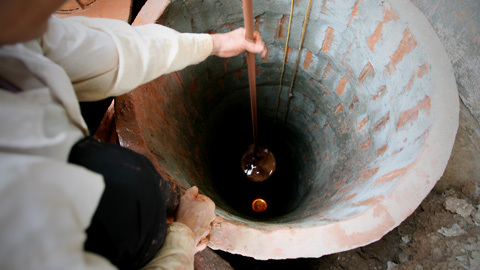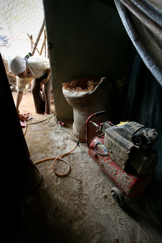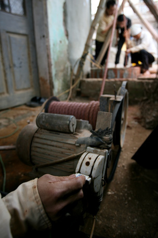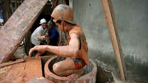 ![]() Nhóm thợ đào giếng của anh Đỗ Văn Minh đều là người cùng thôn Mơ Nông ( Kim Quan – Thạch Thất) đã cùng làm việc từ hơn 20 năm nay. Các chị Chung, Phượng, Thúy chỉ chuyên làm các công việc trên mặt đất. ![]() Anh Đỗ Văn Minh được gọi là Phó cả là người duy nhất trong nhóm làm việc dưới lòng đất hầu như cả ngày. ![]() Chị Hoàng Thị Thúy cho biết ngày trước mọi việc đưa đất đá, gạch lên xuống đều phải kéo bằng sức người, nay được cải tiến bằng máy kéo tời đỡ vất vả hơn rất nhiều. ![]() Không thể thiếu chiếc máy nén khí, không khí được thổi xuống lòng giếng qua ống nhựa để Phó cả dễ thở khi làm việc sâu dưới lòng đất. ![]() Phó cả, thợ chuyển đất, gạch và thợ điều khiển ròng rọc phải phối hợp rất ăn ý mới tránh được tai nạn đáng tiếc có thể xảy đến bất cứ lúc nào. ![]() Nguồn nước ngầm đã cạn kiệt nhiều năm nay ở Thạch Thất nên giếngthường phải đào sâu trên 30 m may ra mới có nước. Ở độ sâu này chỉ một viên sỏi nhỏ rơi xuống cũng có thể gây tai nạn với người ở dưới nên cẩn thận là đức tính quan trọng của thợ đào giếng. ![]() Thường mỗi giếng phải đào mất chục ngày, có nước hay không thì gia chủ vẫn phải trả tiền công. Anh Vũ Đình Thuyến, chủ của chiếc giếng đang đào rất hồi hộp xem nắm cát vừa lấy dưới giếng ở độ sâu 30m cho biết đã đào đến cát thì chỉ thêm vài mét nữa là biết chiếc giếng có nhiều hay ít nước. ![]() Đổ đất là công việc nặng nhọc, nhưng tìm được chỗ để đổ đất mới là việc khó ở vùng tuy là nông thôn nhưng mật độ dân cư cao này, chị Kiều Thị Phượng cho biết nhiều khi chỗ đổ đất cách nơi đào giếng hàng cây số khiến càng vất vả hơn. ![]() Mỗi ngày Phó cả Minh làm việc dưới lòng giếng trên dưới 10 giờ. ![]() Chiếc ròng rọc dùng để kéo đất, gạch cũng là để đưa Phó cả lên xuống, tất nhiên khi kéo người phải có hai, ba người cùng kéo hỗ trợ. ![]() Dù đã làm cái nghề đào giếng hơn 20 năm nhưng mỗi lần lên mặt đất sau nhiều giờ âm thầm đào bới một mình dưới lòng đất ướt át anh Minh vẫn có cảm giác sảng khoái như vừa trở về từ “âm phủ”. ![]() |