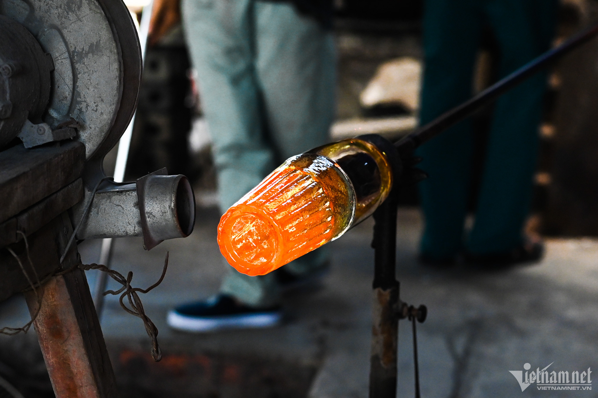 Khi thủy tinh đủ nhiệt và tan chảy hoàn toàn, những người thợ chính sẽ bắt tay vào ca làm việc mới. Một dây chuyền gồm 5 người thợ thổi, 1 người cắt miệng cốc, 1 người ủ tro để cốc nguội liên tục làm việc cho đến khi thủy tinh nóng chảy trong lò hết mới thôi.