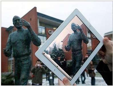 Chụp ảnh tượng Steve Jobs với iPad tại Budapest.
