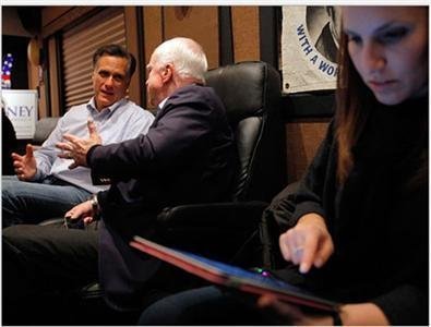 Ứng cử viên tổng thống đảng Cộng hòa kiêm cựu thống đốc bang Massachusetts Mitt Romney và Thượng nghị sĩ Mỹ John McCain nói chuyện về chiến dịch tranh cử của Romney hồi cuối tháng 1/2012, một ngày trước khi Romney giành chiến thắng tại Iowa trong khi thư ký của chiến dịch- Andrea Saul - vẫn miệt mài làm việc trên iPad.