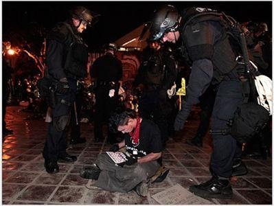 Cảnh sát bắt giữ một người biểu tình cùng chiếc iPad của mình khi họ xâm phạm khu vực giới nghiêm bên ngoài City Hall ở Los Angeles hồi cuối tháng 11 năm ngoái.