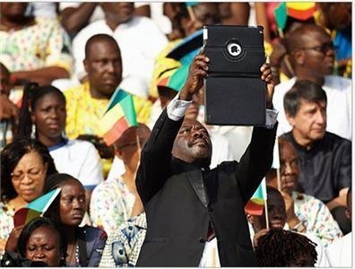Một người đàn ông sử dụng iPad để ghi lại sự xuất hiện của Đức Giáo Hoàng tại Stade de l'Amitie (Sân vận động Hữu Nghị) ở trung tâm kinh tế Cotonou - Benin.