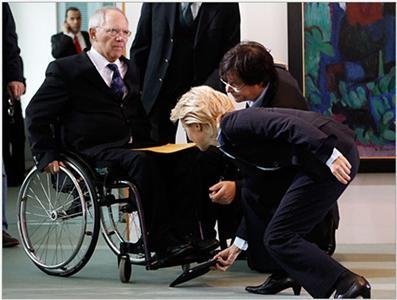 Bộ trưởng Nội vụ Đức Thomas de Maiziere nhìn Bộ trưởng Lao động Ursula von der Leyen (bên phải) nhặt chiếcc iPad của Bộ trưởng Tài chính Wolfgang Schaeuble khi nó bị rơi xuống sàn nhà.