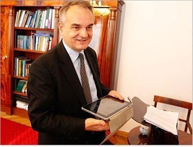 Phó Thủ tướng Ba Lan với chiếc iPad hỏng trên tay trong văn phòng của ông tại thủ đô Warsaw.