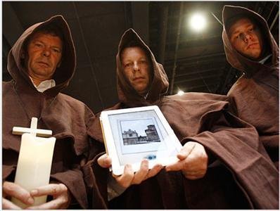 Những nhân viên nhà xuất bản Luebbe Digital cải trang như những thầy tu giữ trên tay chiếc iPad đang hiển thị hình ảnh cuốn tiểu thuyết nổi tiếng Apocalypsis (Bướm đêm) tại Hội chợ Sách Frankfurt ngày 13 Tháng Mười 2011.