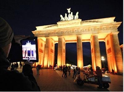 Một người đàn ông dùng iPad để chụp lại cổng Brandenburg lung linh trong Lễ hội Ánh sáng Berlin- Đức.