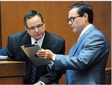Cảnh sát Los Angeles Detective Scott Smith (trái), đọc thông tin từ phòng luật sư Ed Chernoff trong vụ điều tra bác sĩ Conrad Murray và cái chết của ngôi sao nhạc pop Michael Jackson tại Los Angeles trên iPad.