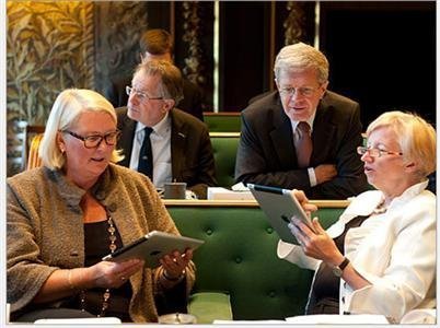 Thượng nghị sĩ De Vries.-Leggedoor (trái), Flierman và Martens (phải) dùng iPad tại Nhà Quốc hội ở Hague. Các thành viên của Thượng viện Hà Lan sẽ không còn phải còng lưng với việc mang theo cả chồng tài liệu dạng bản in nữa vì tất cả đã được lưu trữ trong những chiêc iPad tiện dụng.