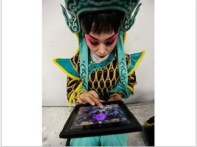 Một diễn viên Kinh kịch chơi game trên iPad trước giờ biểu diễn tại cuộc thi tìm kiếm diễn viên tài Bắc Kinh lần thứ nhất.