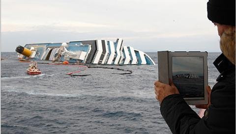 Một người đàn ông trên phà đang dùng iPad để ghi lại những khoảnh khắc cuối cùng của chiếc tàu Costa Concordia trước khi nó bị chìm sâu xuống lòng biển vùng Giglio, Italia.