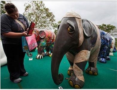 Một khách du lịch dùng iPad để chụp hình những tác phẩm điêu khắc voi trong dự án nổi tiếng “Damaged Dumbo” của Renato Barja Jr trưng bày tại Vườn Bách thảo Singapore. Tác phẩm điêu khắc này là một phần của tác phẩm lớn “Cuộc diễu hành của đàn voi” với 162 tác phẩm điêu khắc khác nhau.