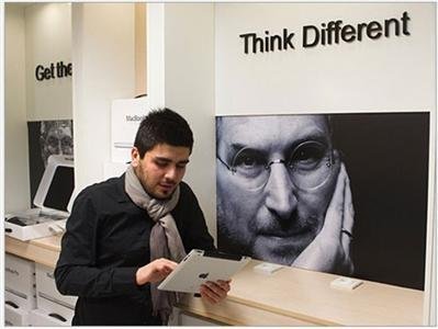 Một người đàn ông với chiếc iPad của mình cạnh chân dung Steve Jobs trong một cửa hàng công nghệ khu Payetakht phía Bắc Tehran.