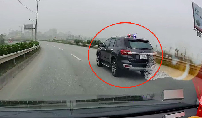 Chiếc xe Ford Everest mang BKS màu trắng của Hà Nội (30G) liên tục nháy đèn, hú còi xin vượt trên cao tốc. Đáng chú ý, loại đèn nháy, còi hú và cả cờ gắn phía trước giống như loại trên xe ưu tiên.