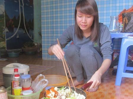 | Nguyễn Thị Vinh đang nấu ăn tại nhà trọ |