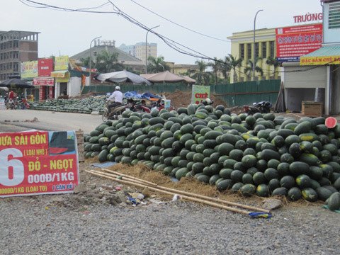 - Hơn 1 tháng nay, tại đoạn đường Hồ Tùng Mậu - Cầu Giấy (Hà Nội) xuất hiện tình trạng bày bán dưa hấu “Made in Sài Gòn” tràn lan ngay tại lòng đường đang thi công.