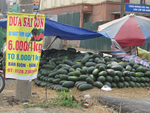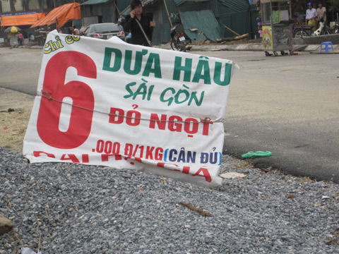 Ngoài ra, những biển hiệu tạm bợ đủ loại mang tính chất quảng cáo chất lượng và giá cả của dưa hấu “Sài Gòn” cũng được treo một cách tùy tiện từ 6.000 đến 8.000 đồng/kg.