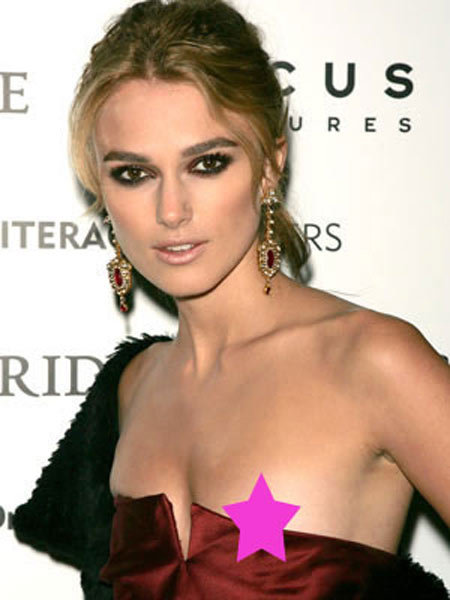 | Kiểu váy quây có lẽ không hợp với vóc dáng và vòng 1 nhỏ bé của Keira Knightley nên nó đã tụt xuống khi cô bước trên thảm đỏ. |