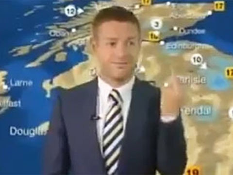 Tomasz Schafermaker, người dẫn chương trình thời tiết của đài BBC đã được phen "hú vía" trong phút chốc không ý thức được rằng mình đang dẫn chương trình truyền hình trực tiếp khi giơ "ngón tay thối" của mình về phía máy quay.